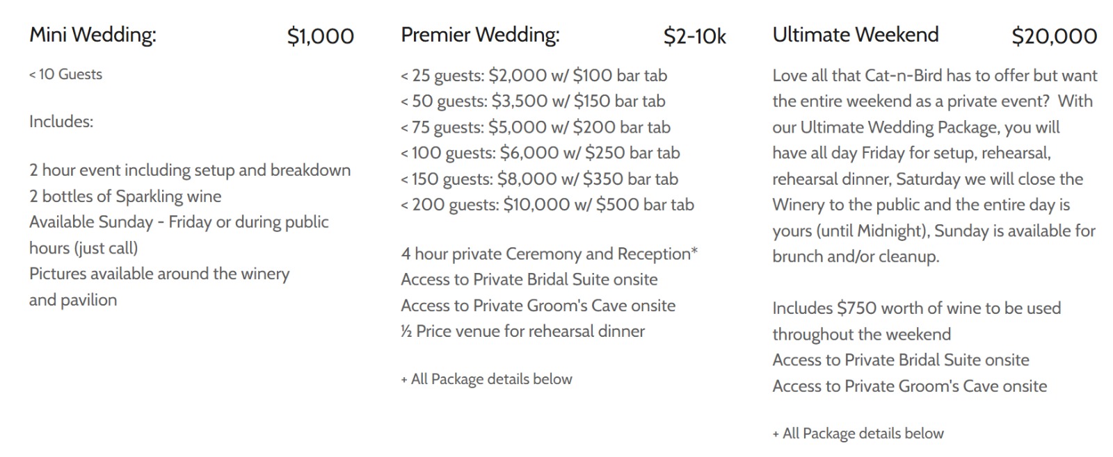 Wedding costs at Cat-n-Bird Winery — Outdoor Ceremony Area vary based on several factors: